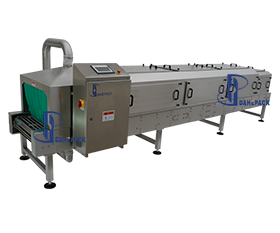 本機由五段組成,第一段為吹掃除塵,第二、三、四段為紫外線燈殺菌,第五段為過渡 吹掃段由八個吹風口組成,上下各三個,左右各一個,隨機配蝸牛增壓吹風機(1.1kw)