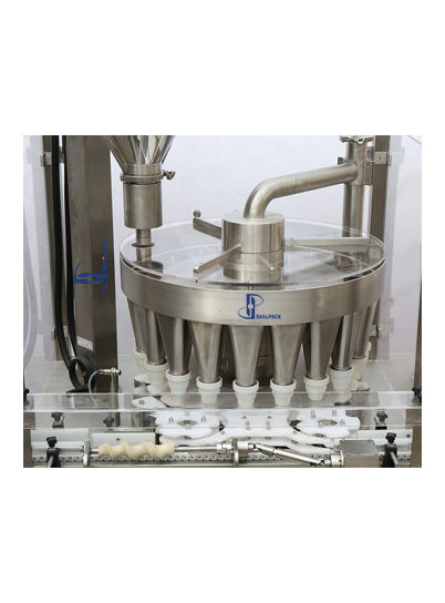 旋轉(zhuǎn)式充填機(jī)具有很高的生產(chǎn)效率和生產(chǎn)速度,即使在非??量痰纳a(chǎn)要求下,旋轉(zhuǎn)式充填系統(tǒng)將物料連續(xù)的分發(fā)到旋轉(zhuǎn)的多工位漏斗里,瓶子在漏斗下,一個(gè)瓶子對(duì)應(yīng)一個(gè)漏斗,不等距螺旋和星形轉(zhuǎn)盤將瓶子均勻的對(duì)應(yīng)到每一個(gè)漏斗下同步旋轉(zhuǎn)并振動(dòng),螺桿計(jì)量機(jī)精確的將物料充填到漏斗里,然后物料在星形轉(zhuǎn)盤旋轉(zhuǎn)四分之三圈的時(shí)間內(nèi)從漏斗落到瓶子里,特別適用于瓶子口徑小,但包裝速度要求高的各種粉末和小顆粒物料。