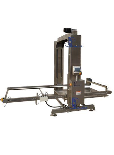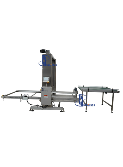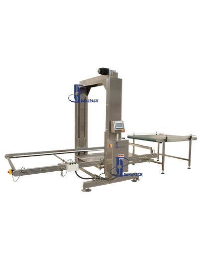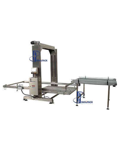 工作原理:人工用地牛將整托盤空罐運(yùn)至指定位置(碼垛方式為罐口向上),點(diǎn)動(dòng)啟動(dòng)按鈕,系統(tǒng)會(huì)自動(dòng)通過(guò)光電檢測(cè)確定空罐托盤高度,根據(jù)后面緩存皮帶對(duì)罐子的需求,將一層空罐通過(guò)刮板推至緩存面板上,然后再調(diào)整上下高度與后道的緩存皮帶進(jìn)行高度對(duì)接,再將空罐送至緩存皮帶上待用。緩存皮帶會(huì)根據(jù)理罐機(jī)對(duì)罐子的需求,將罐源源不斷的送至理罐機(jī)上。卸垛機(jī)每卸完一層空罐,設(shè)備自動(dòng)提醒,收到提醒后人工將兩層空罐之間的紙板拿走,直至整個(gè)托盤上的空罐全部卸完,再進(jìn)行下一個(gè)循環(huán)。